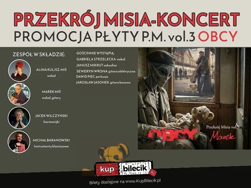 Przekrój Misia wraca z finałem swojej muzycznej trylogii! Po płytach "Obrazki na ścianie" i "Ślad na skale" przyszedł czas na "Obcego" - najbardziej energetyczne i różnorodne wydawnictwo zespołu. To akustyczny (choć nie tylko) kwartet z ponad 12-letnim stażem, który konsekwentnie stawia na autorską twórczość. Ich znakiem rozpoznawczym są mocne teksty i muzyka, która nie zamyka się w jednym gatunku. Na scenie usłyszycie mieszankę rocka, bluesa, latynoskich rytmów, celtyckich inspiracji, a nawet elementów muzyki klasycznej - wszystko spięte charakterystycznym stylem zespołu i charyzmatycznym wokalem lidera, Marka Misia.